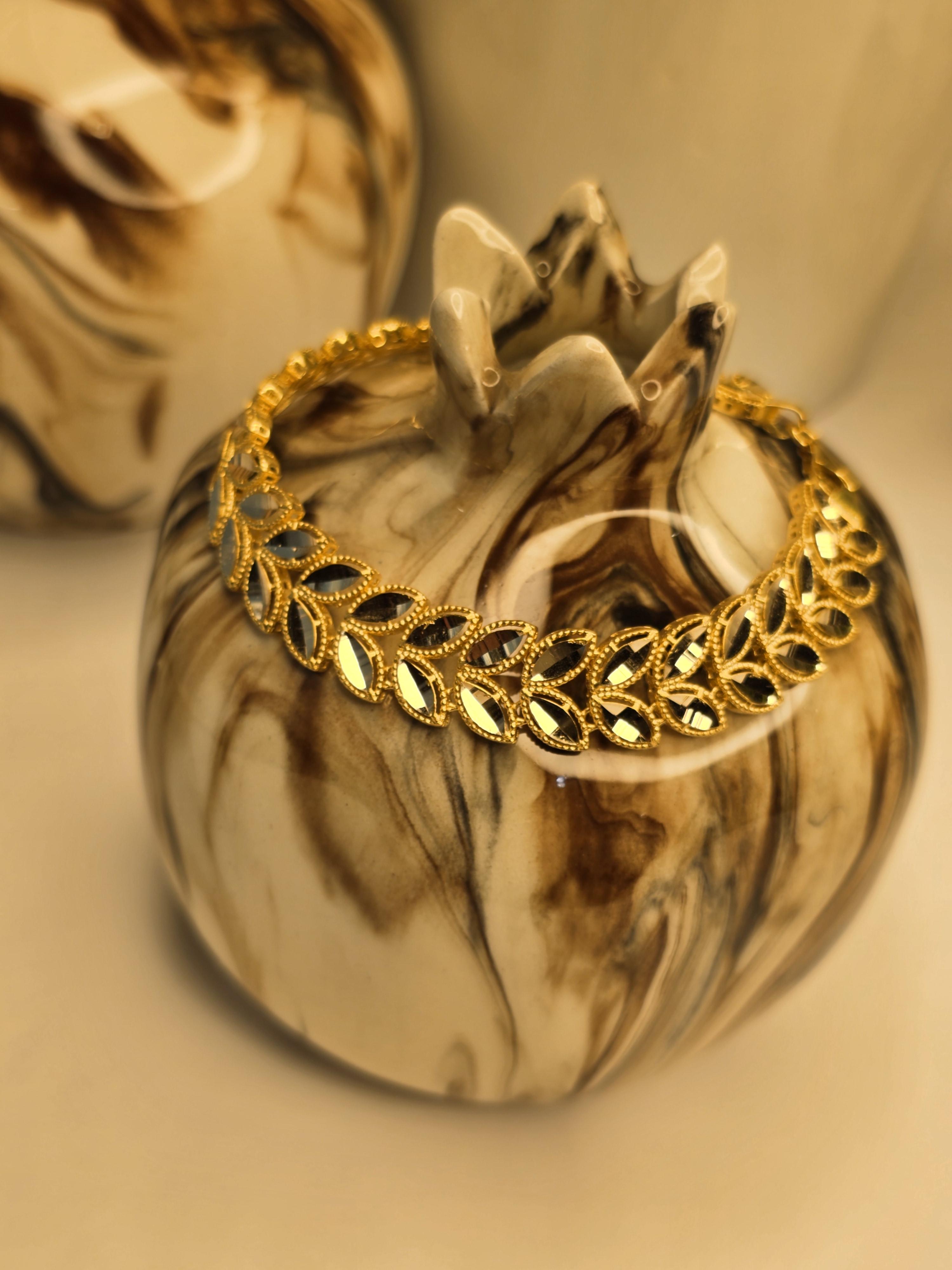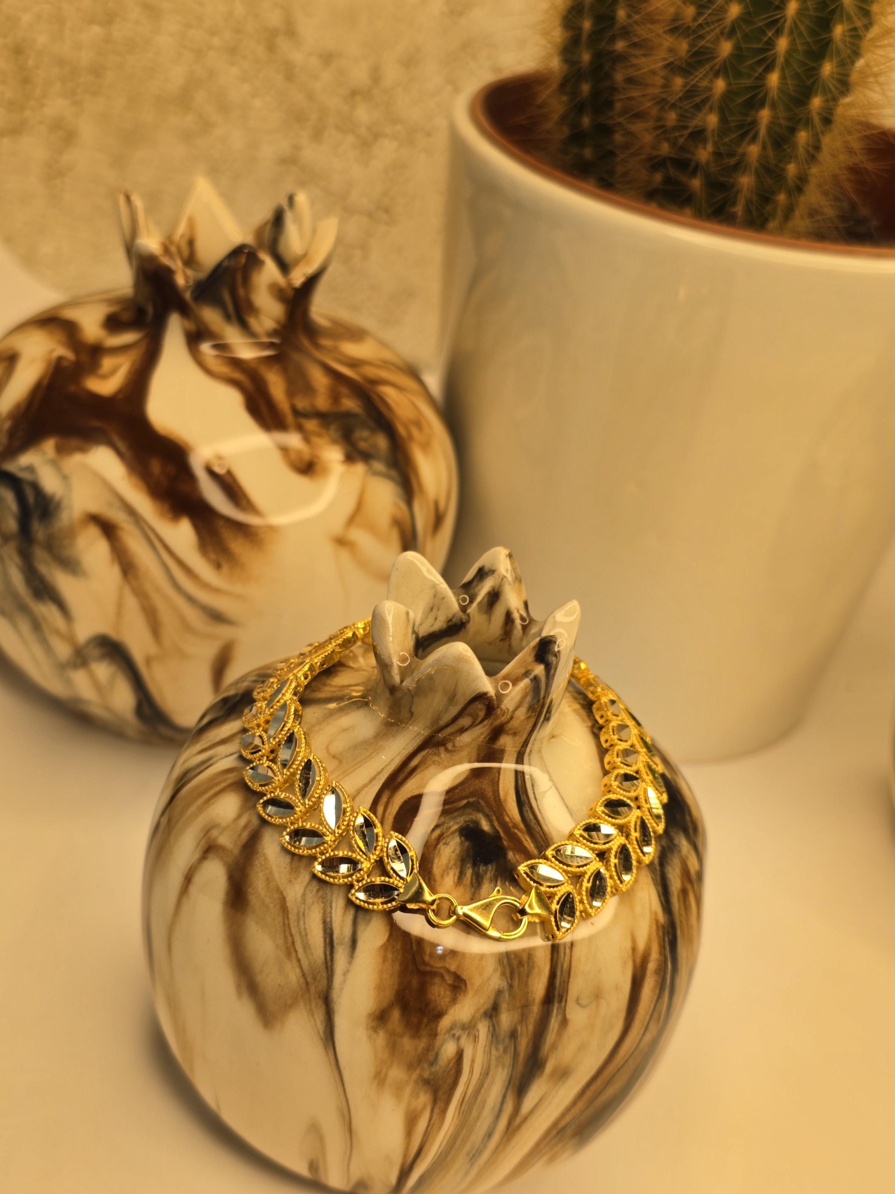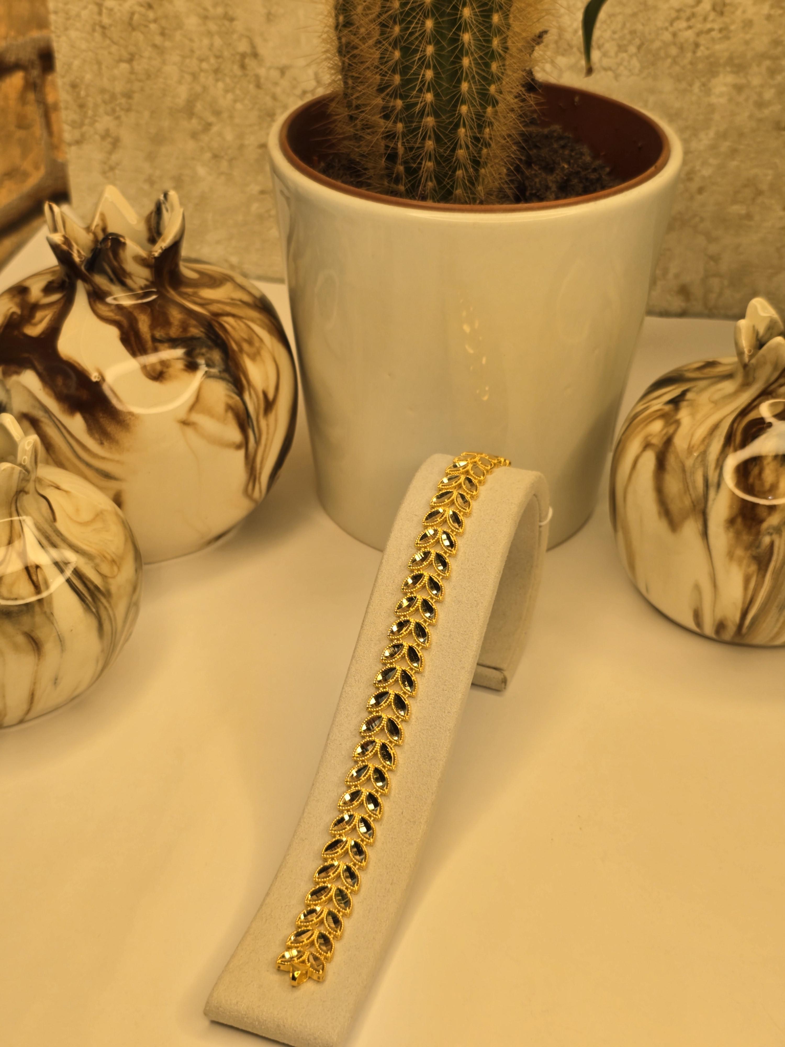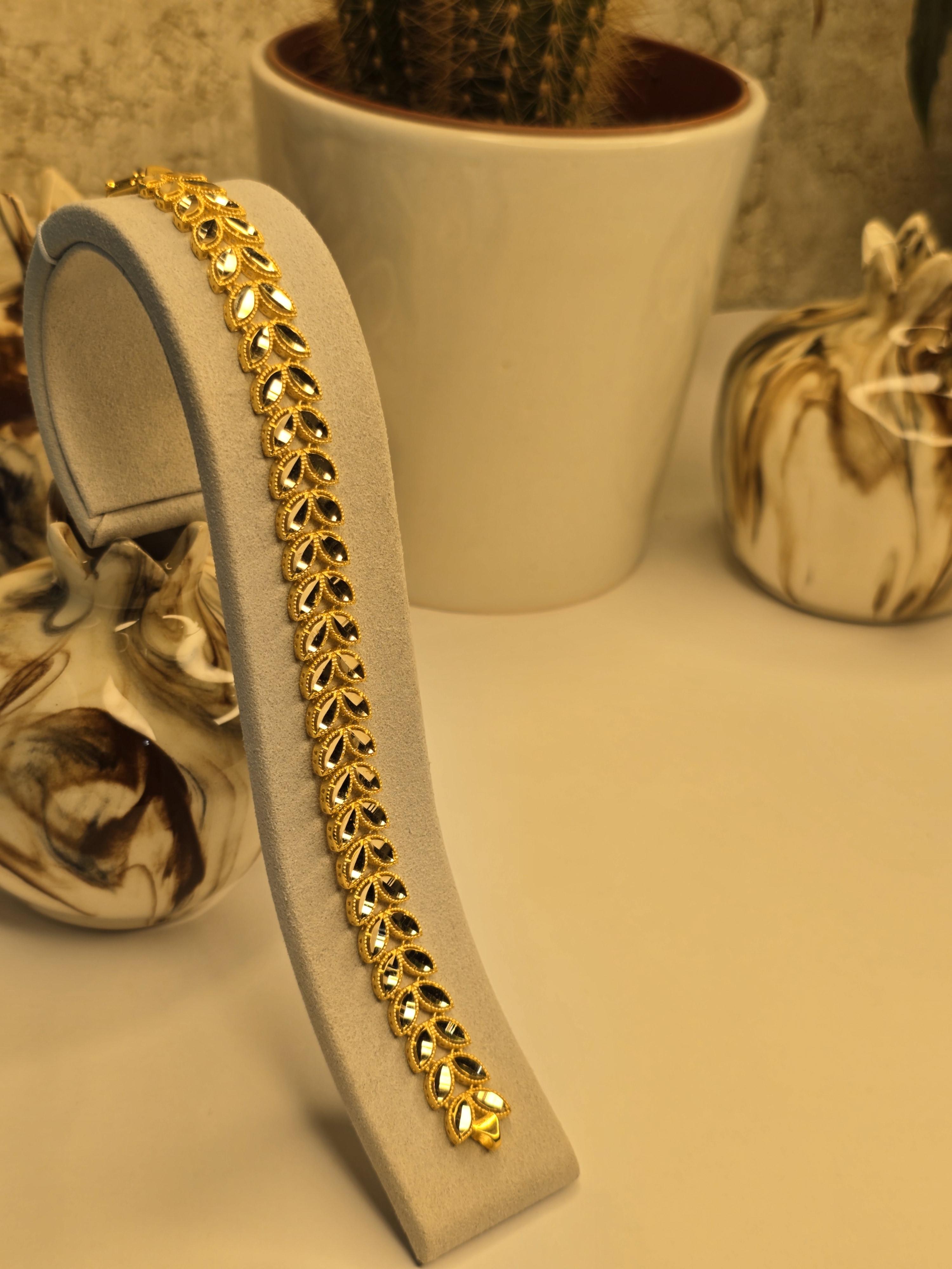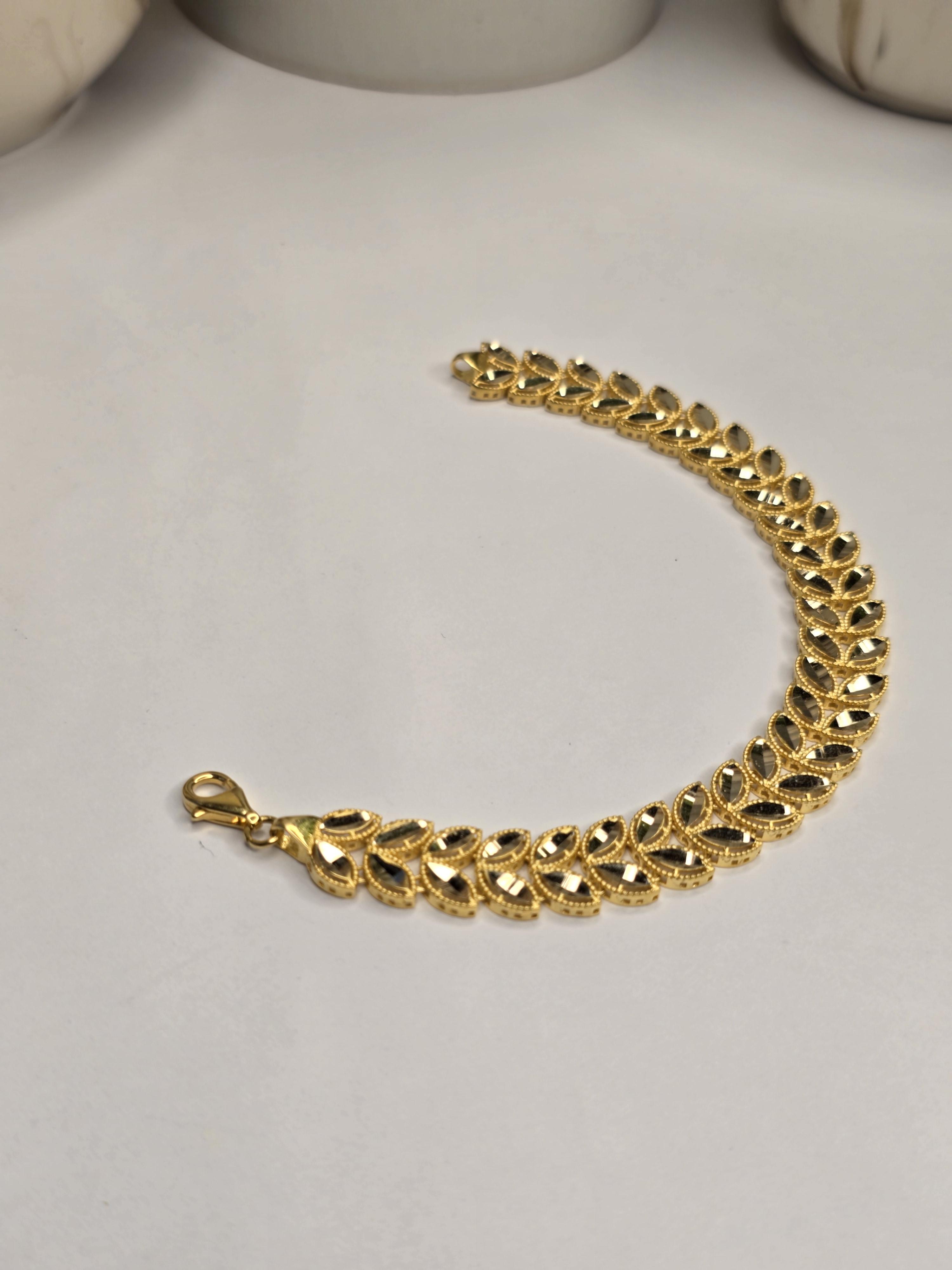 Bu bileklik, altının 14 ayar kalitesi ile zarif bir şekilde işlenmiş olup, parlak yüzeyi sayesinde ışıkla oyunlar oynayarak göz alıcı bir etki yaratmaktadır. İnce detayları ve akıcı formu, zarafeti ön planda tutarak her türlü kıyafetle mükemmel uyum sağlar.