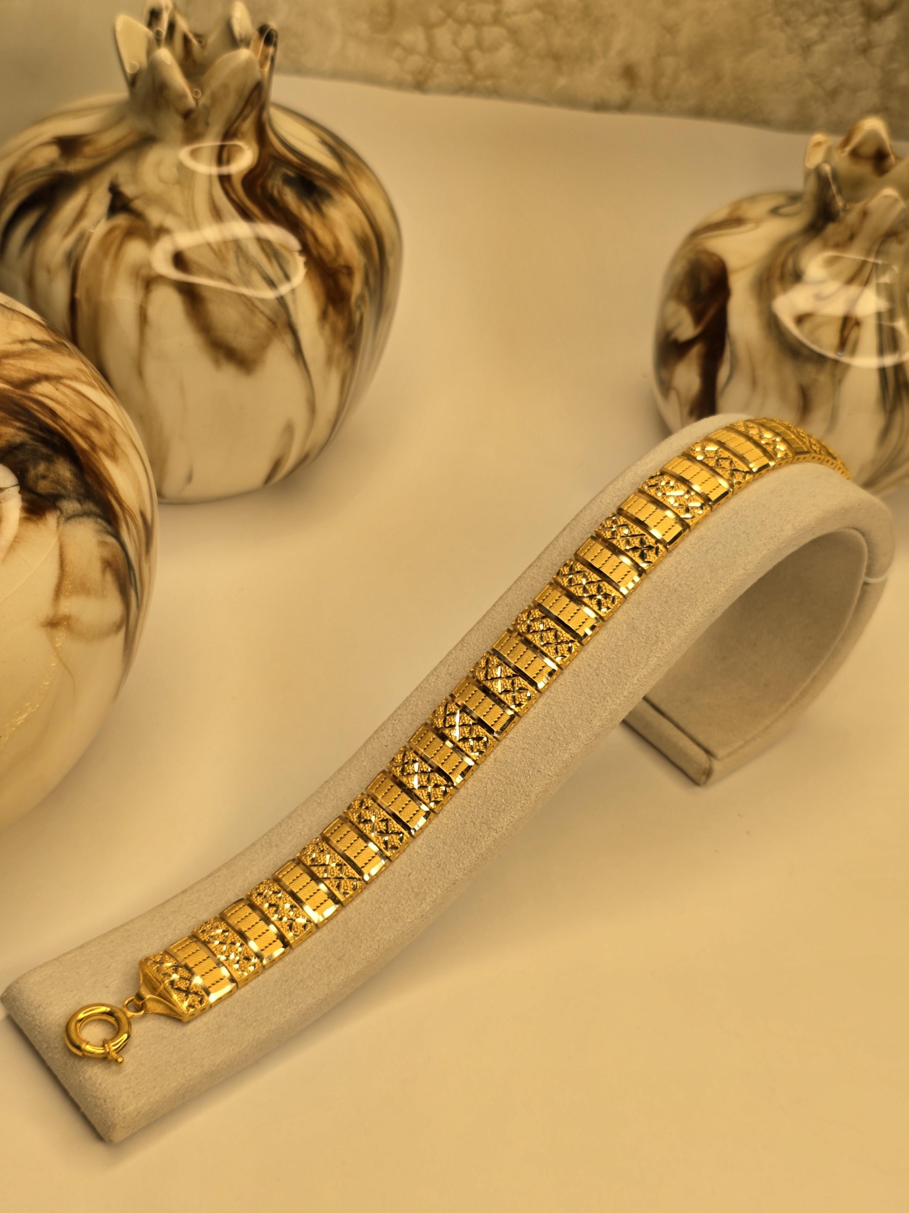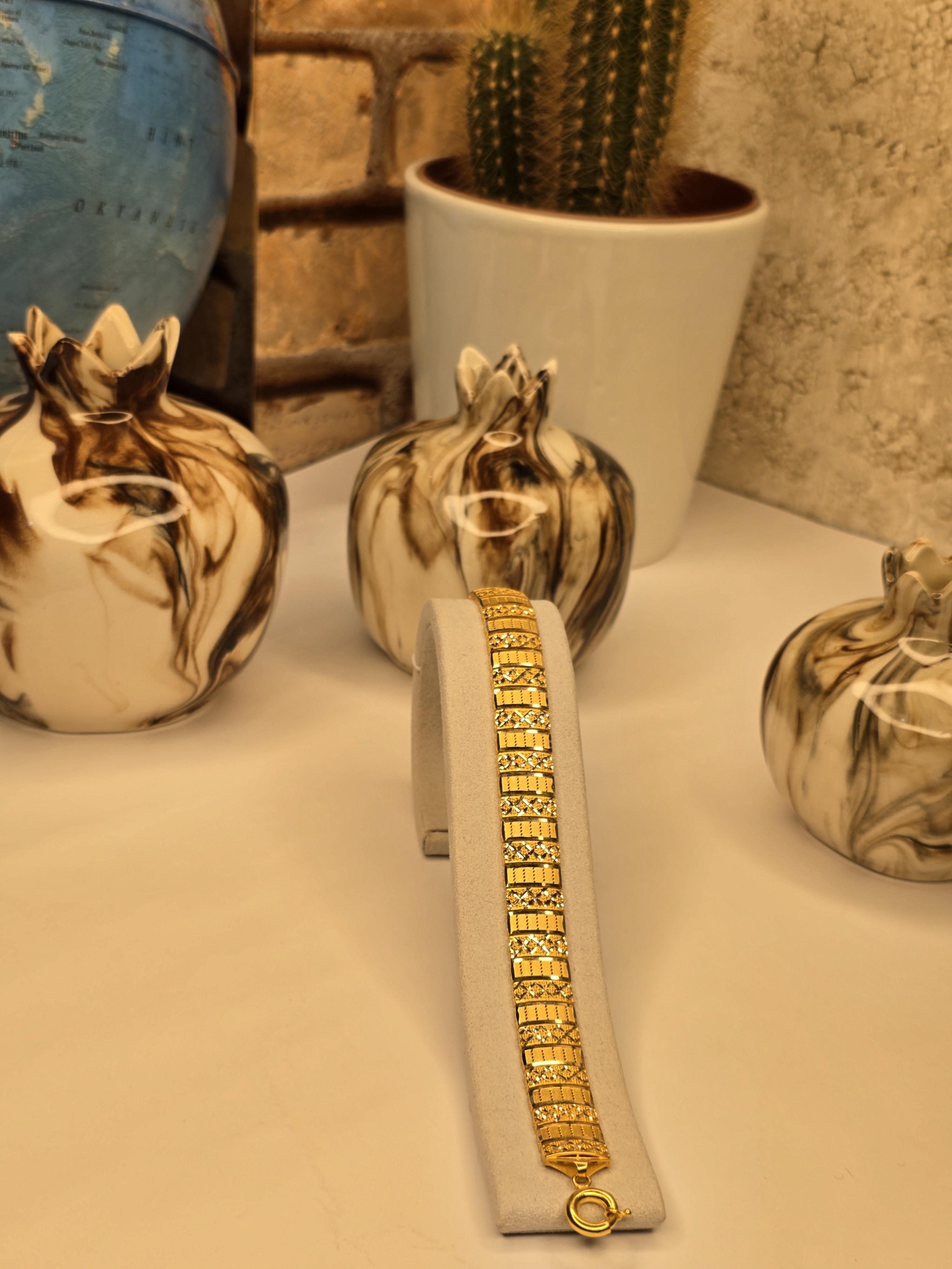 Bilekliğin tasarımında kullanılan 14 ayar altın, hem kalitesini hem de dayanıklılığını artırmaktadır. Kullanılan malzeme, parlak ve pürüzsüz bir yüzey sunarken, zarif detayları ile göz alıcı bir görünüm sağlamaktadır. Fantazi bileklik modeli, modern ve klasik tarzları bir araya getirerek tüm yaş gruplarına hitap etmektedir.