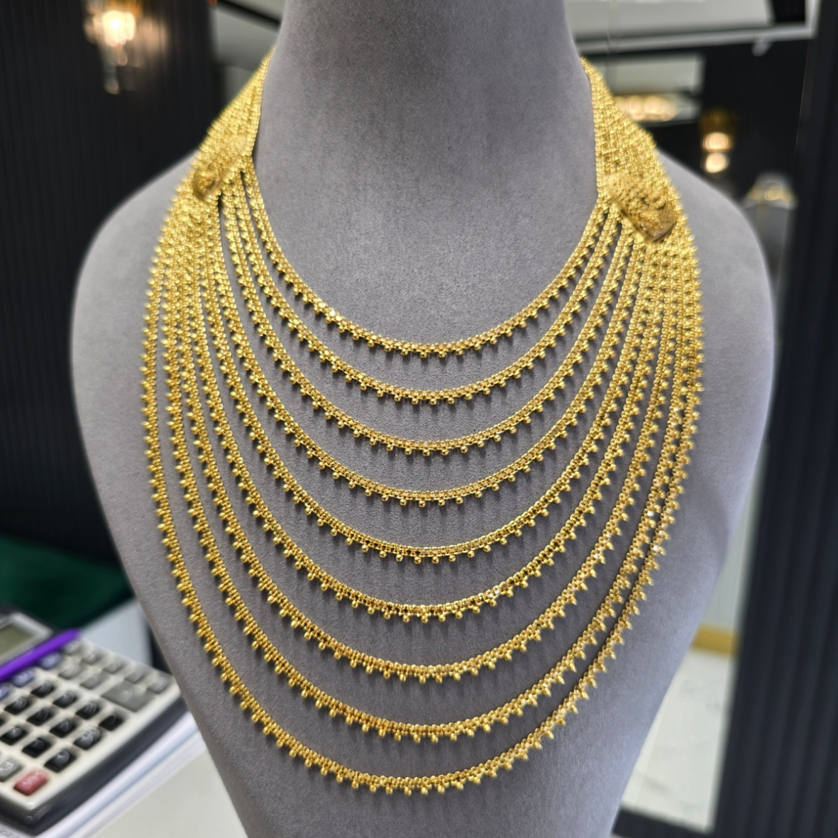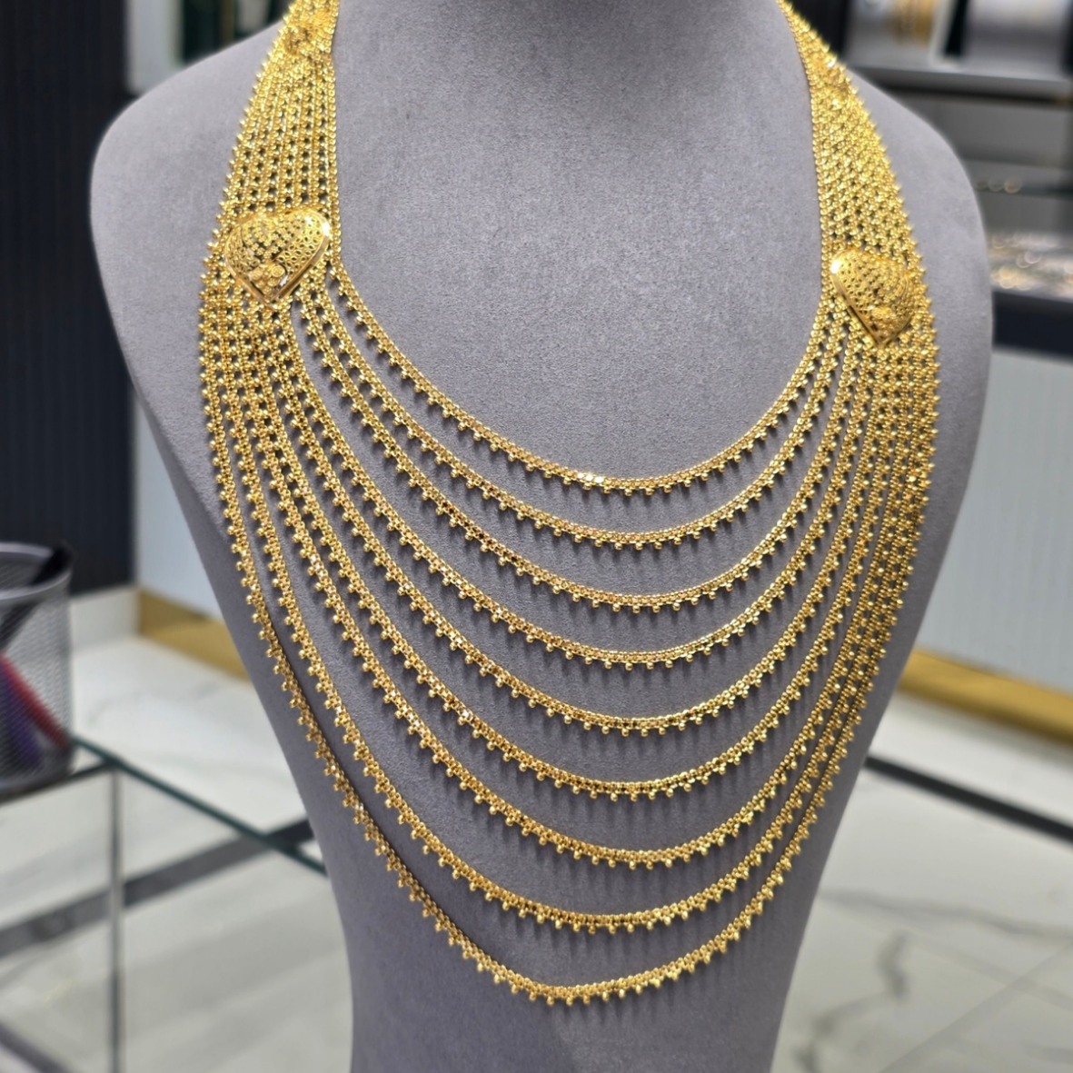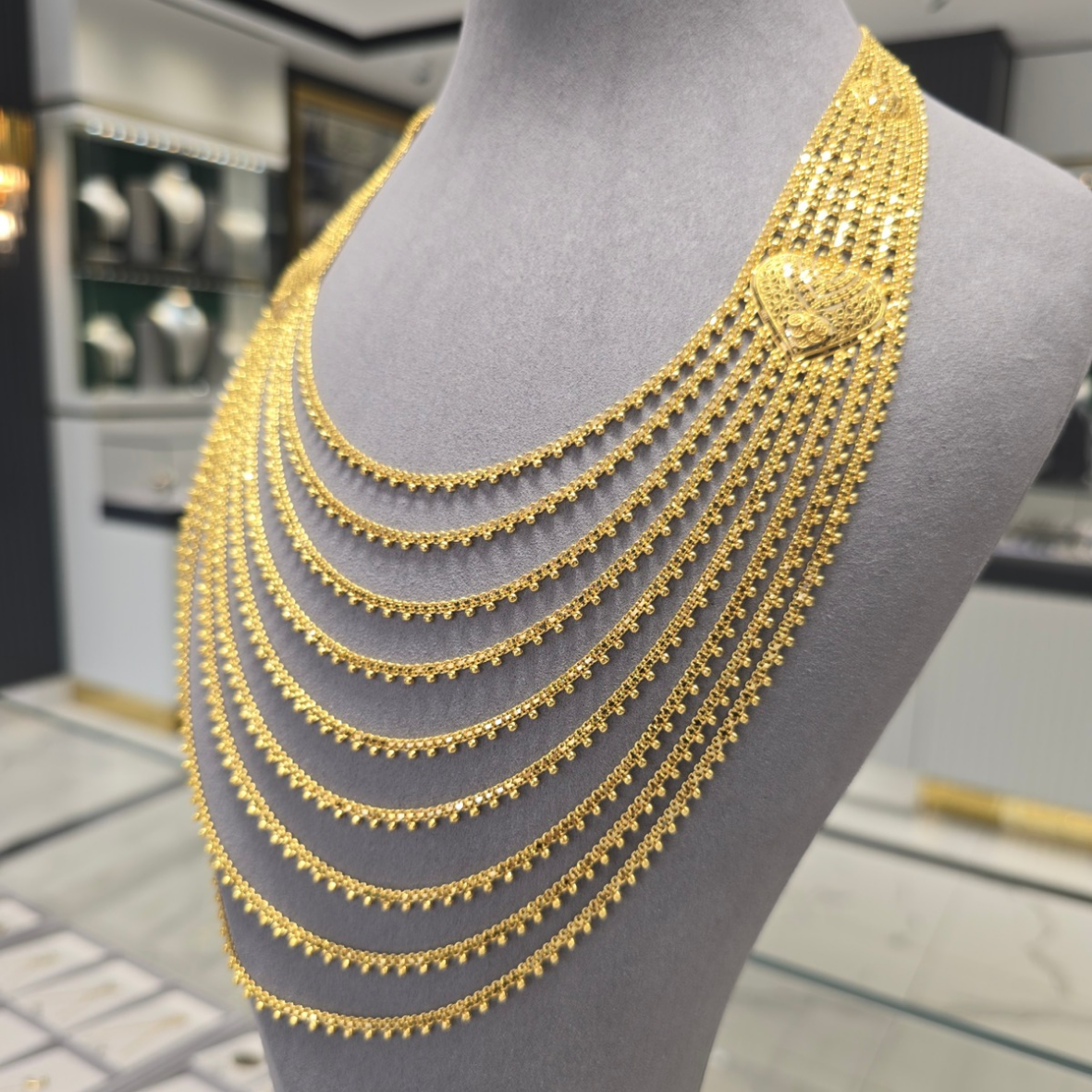 Şıklığı ve zarafetiyle dikkat çeken 14 Ayar Hint Madonna Akıtma 9 Sıra, her özel anınızda size eşlik edecek bir parça. Bu göz alıcı takı, zarif detayları ve özenle işlenmiş tasarımıyla öne çıkıyor. 81.65 gram ağırlığı ile hem gösterişli hem de kullanışlı bir aksesuar arayanlar için mükemmel bir seçenek.