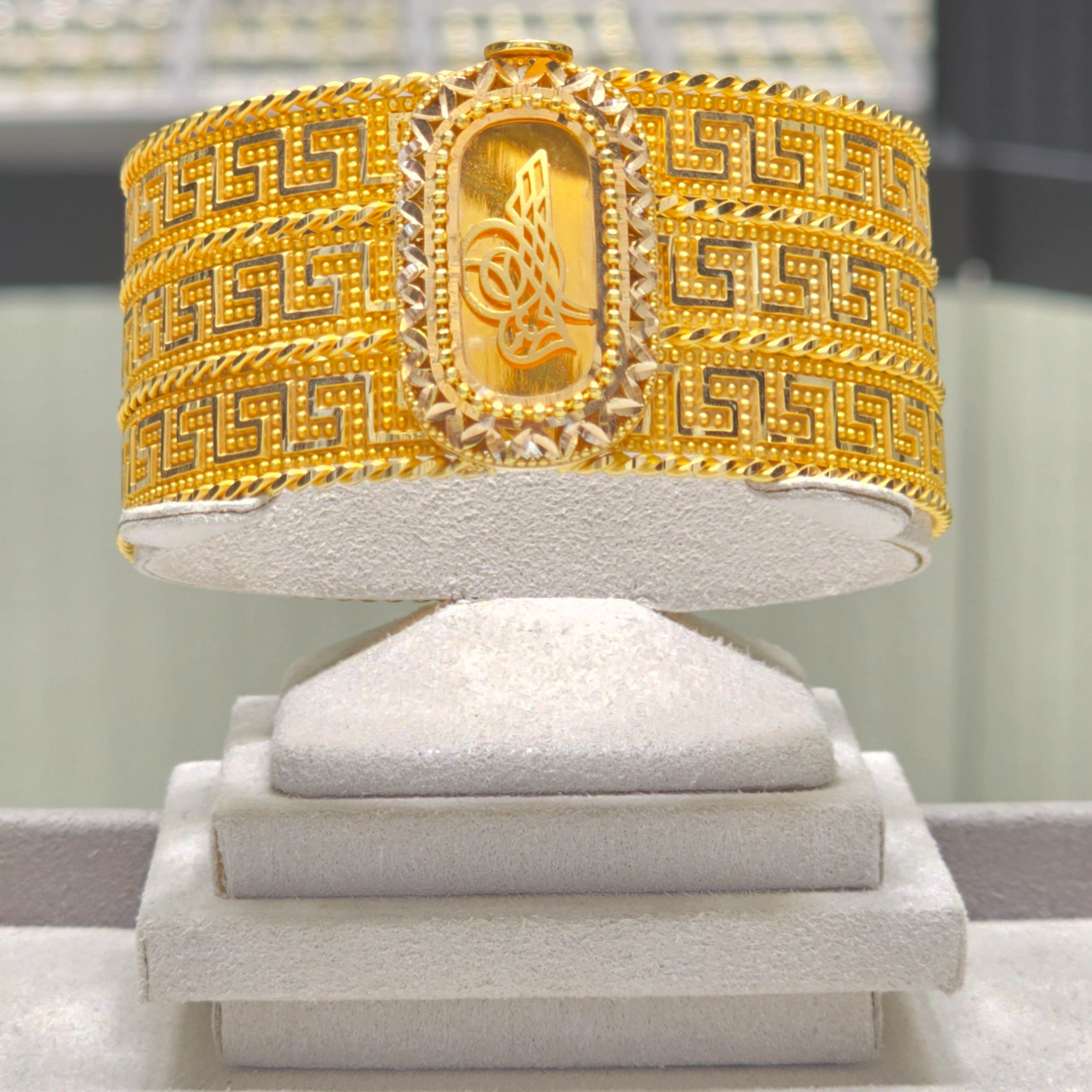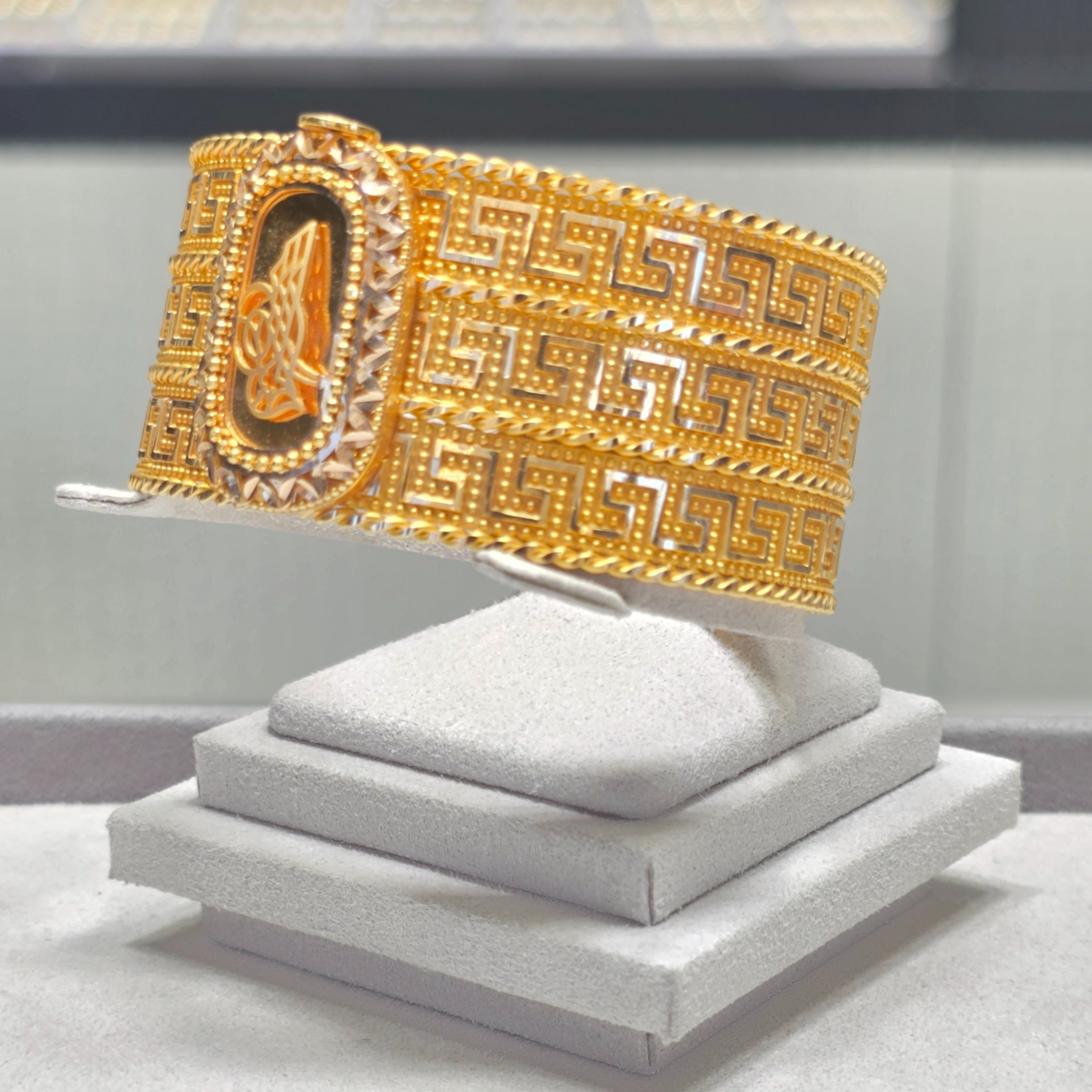 Bu muhteşem kelepçe, ünlü moda evi Versace'nin ikonik desenleriyle süslenmiştir. Parlak altın dokusu, göz alıcı bir estetik sunarken, ince işçilikle oluşturulan tuğra motifi, tarihi bir dokunuş ekleyerek modern ve klasik unsurları harmanlar. Her bir detayında ustalıkla işlenmiş olan desenler, el yapımı bir sanat eserinin havasını taşır.