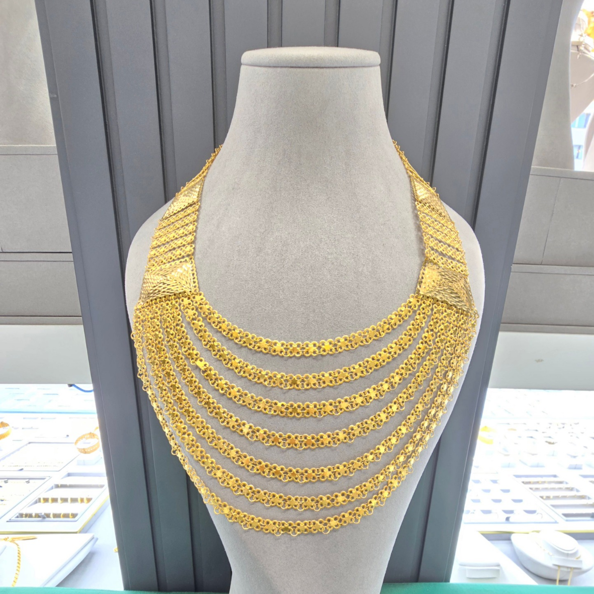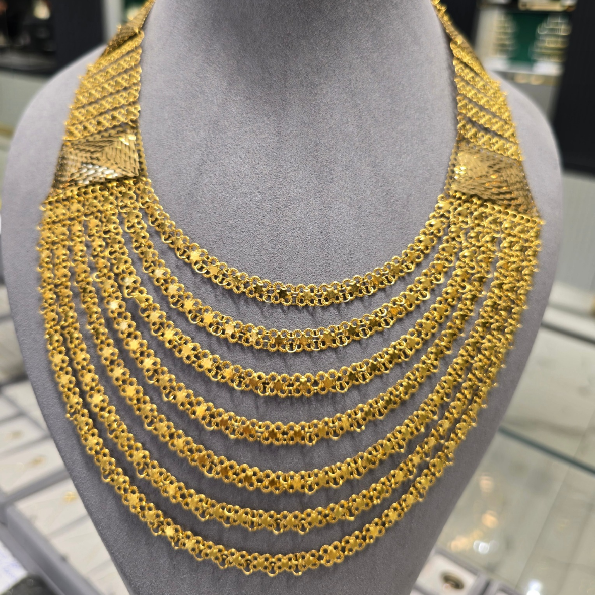22 Ayar Akıtma 7 Sıra kolye, şıklığı ve zarafeti ile dikkat çeken bir mücevherdir. Toplam ağırlığı 50.10 gram olan bu özel kolye, 22 ayar altından ustaca işlenmiştir ve yüksek kaliteli malzemelerle üretilmiştir. Her bir detayında sanat ve estetik bir araya gelirken, zamansız bir şıklık sunmaktadır.