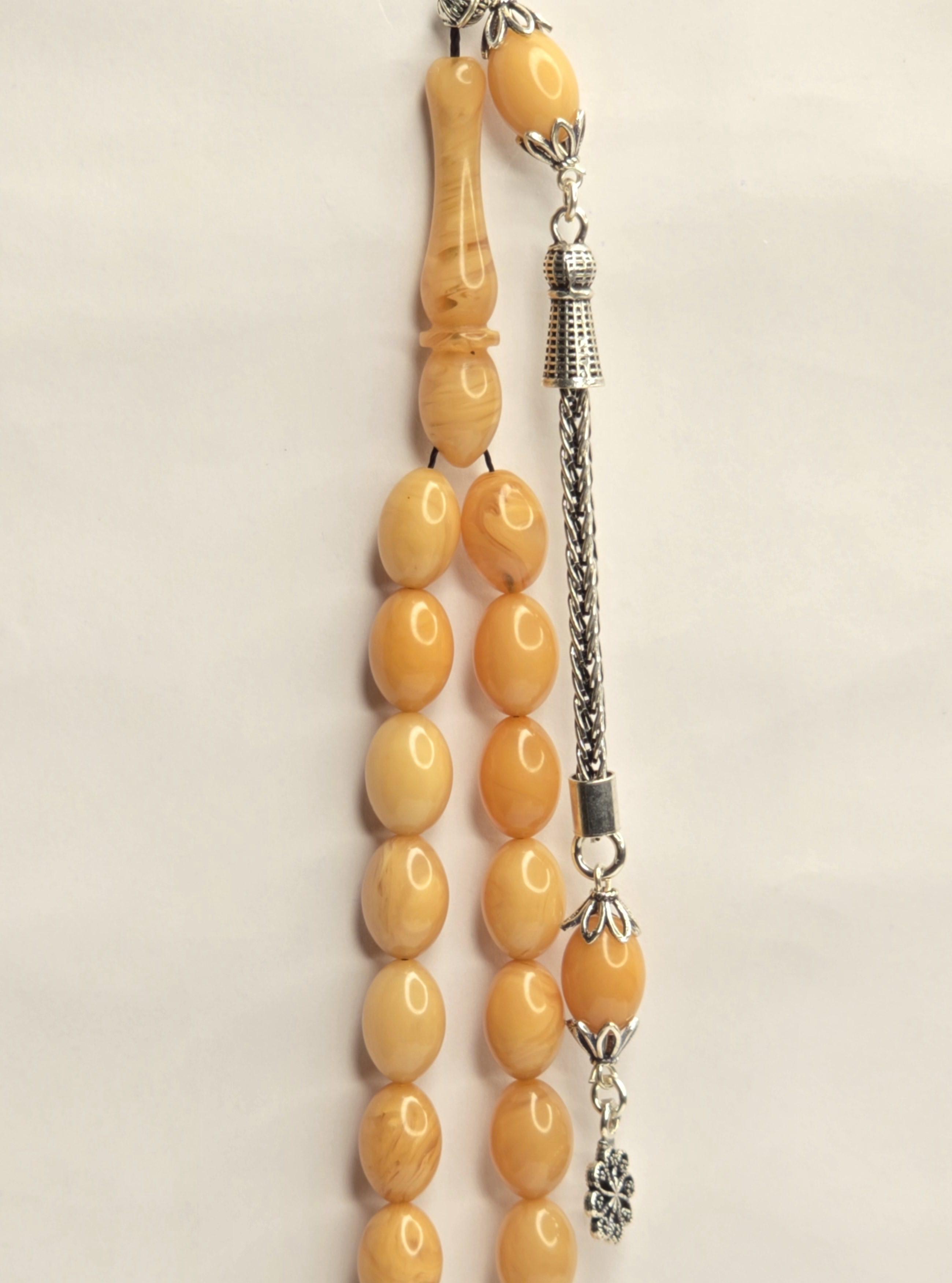 Bu özel tesbihin tam anlamıyla bir sanat eseri olduğunu söyleyebiliriz. Damla kehribar kullanılarak üretilmiş olup, her bir tanesi özenle seçilmiştir. Kehribar, doğal bir fosil özelliği taşır ve bu da ona benzersiz bir dokusu ile renk tonları kazandırır. Damla formu, tesbih kültüründe estetik bir açıdan önemli bir yere sahiptir ve kullanıcılarına rahatlık sunar.
